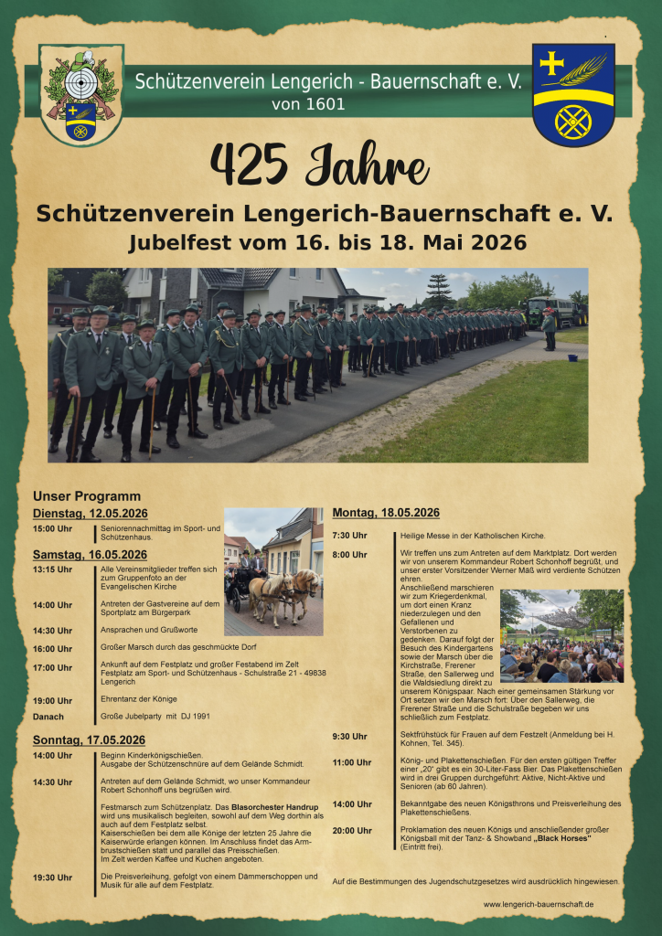 Die Pflege von Tradition und Brauchtum gehört seit jeher zum Selbstverständnis des Schützenvereins Lengerich Bauernschaft. Dazu zählt auch der sorgsame Umgang mit den Symbolen des Vereins. Eine besondere Rolle nimmt dabei die Vereinsfahne ein. Sie begleitet den Verein bei zahlreichen Anlässen, führt die Schützen bei Umzügen an und ist über viele Jahre hinweg sichtbares Zeichen der Gemeinschaft.