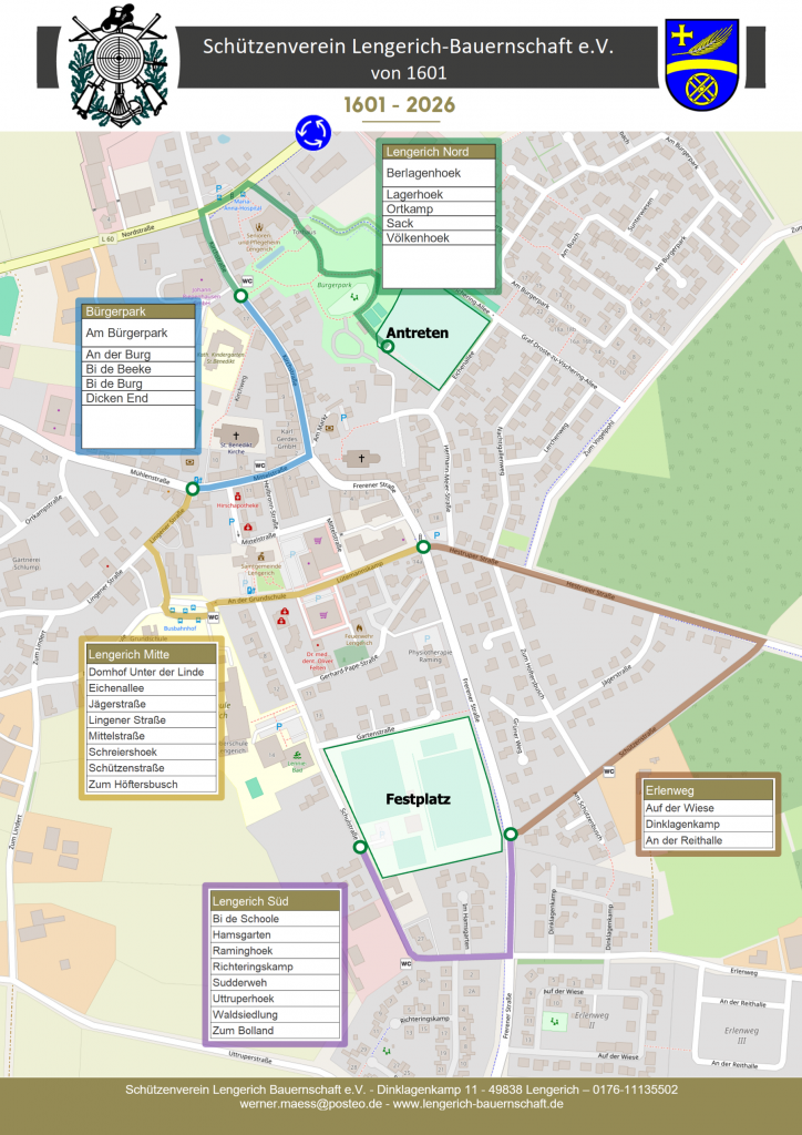 Der Schützenverein Lengerich Bauernschaft e.V. von 1601 freut sich im Jahr 2026 sein 425-jähriges Bestehen feiern und damit auf eine der ältesten Schützenvereinshistorien in unserer Region zurückblicken zu dürfen.